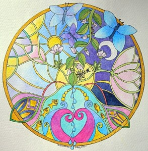 This is my latest piece of art. A bigger version can be seen at Artwyrd. It’s approx. 7″ in diameter, watercolour and Rotring Rapidograph pens on white cold pressed watercolour paper.