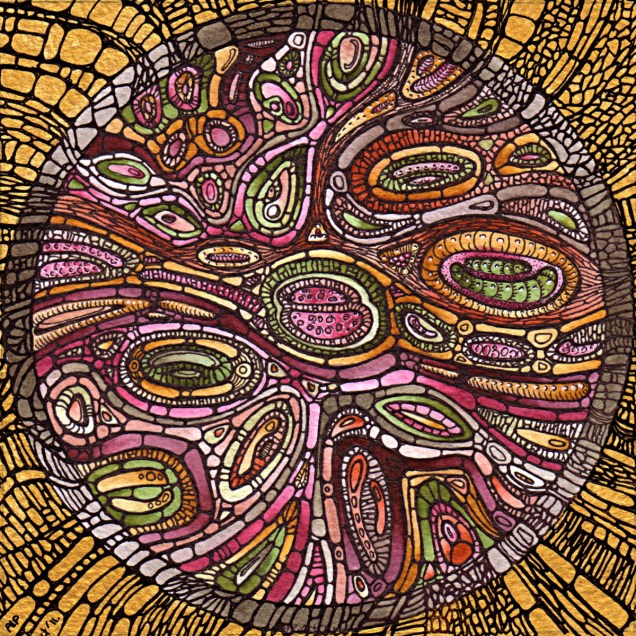 Just trying something different, kind of. the patterns were inspired by photographs of microscopic images of cells. The gold outer with the patterns extended to give a square around the circle seemed the right thing to do.