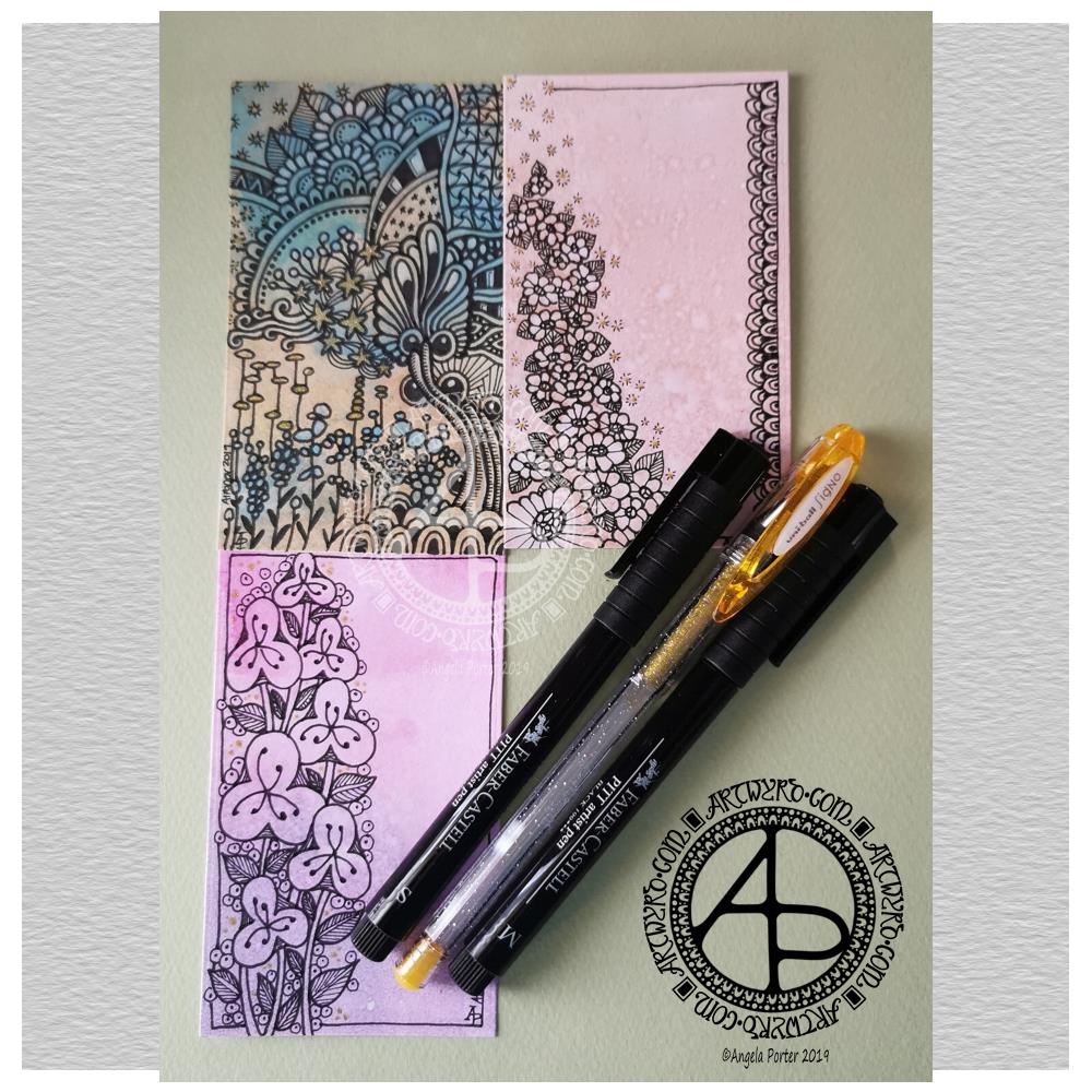 I’m quite pleased with each panel. I do like my entangled art at the top left. However, I’m surprised at how much I like the floral panels, particularly the top right one. The one on the bottom left needs something to be done to the petals. I don’t know if shading with coloured pencils will help to add some depth and dimension to them. I may come back to them in a day or two.