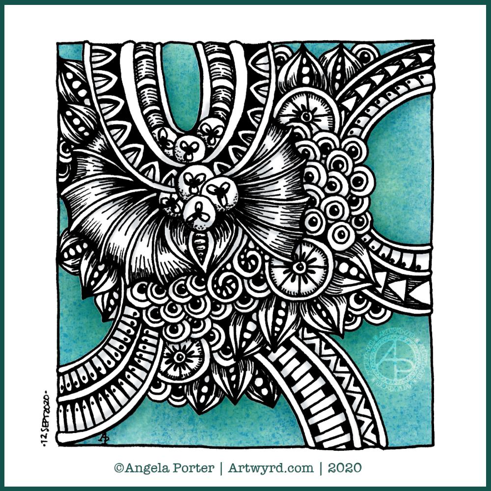 I deliberately left some ‘white space’ so I could fill it with colour. This contrasts rather well with the graphic black and white entangled art design. The coloured background adds depth to the image, and the subtle shading by grey and textural lines adds volume to the design elements and layers.