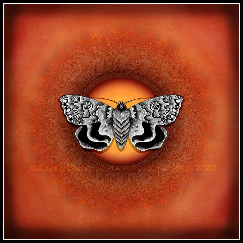 Even though today may not be a typically autumn day, today’s arty offering has warm, fiery tones reminiscent of autumn leaves and bonfires. Of course there’s a black and white, graphic moth illustration.