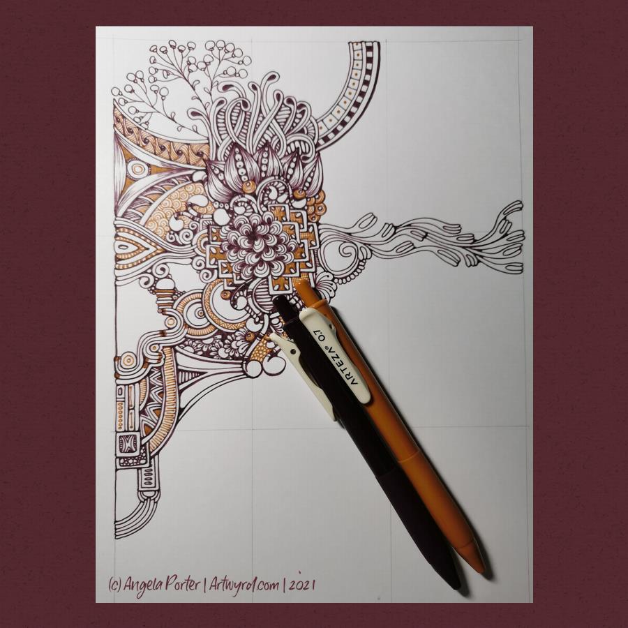 All my life, I’ve had a love of bright colours. I’ve shied away from the more earthy, natural or vintage tones. Recently, however, I’ve been using a lot of brown and more subdued colours in my art. When I saw Arteza had a box of vintage coloured gel pens, I thought I’d give them a go! So, I got out a sheet of bristol board and started to draw with the Vintage Grape Purple and Ginger pens.