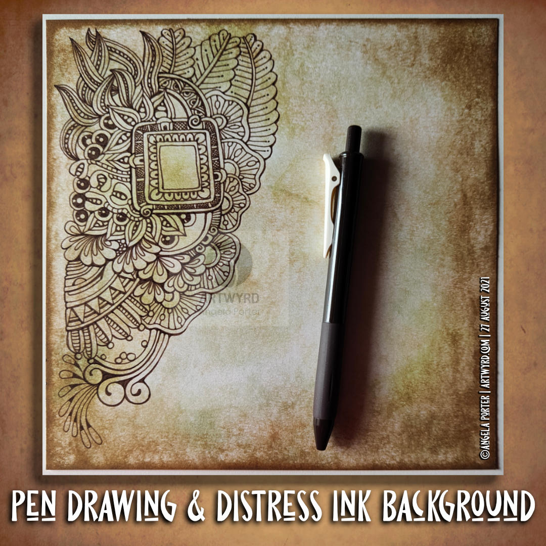 It put me in the mood to create a coloured background (or two) to draw on. This time, I’m using a vintage brown gel pen from Arteza. Usually I’d use black, but I’m starting to explore the possibilities of other colours, particularly on such distressed, grungy backgrounds.