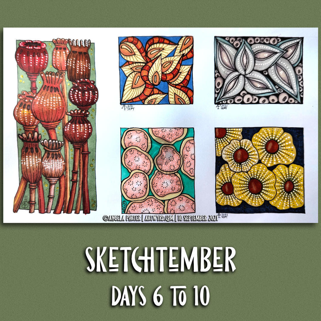 Over the past three or four days, I’ve been quietly working at Sketchtember. I’ve veered away from the list of herbs to enjoy drawing, and colouring, all kinds of seed pods – real and more imaginative.