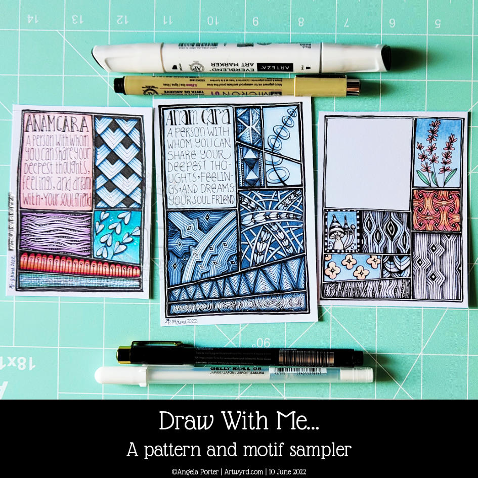 This is a lovely way for me to indulge my love of hand-lettering, patterns, stylised motifs, colour, shadow, texture and boxes split into boxes!