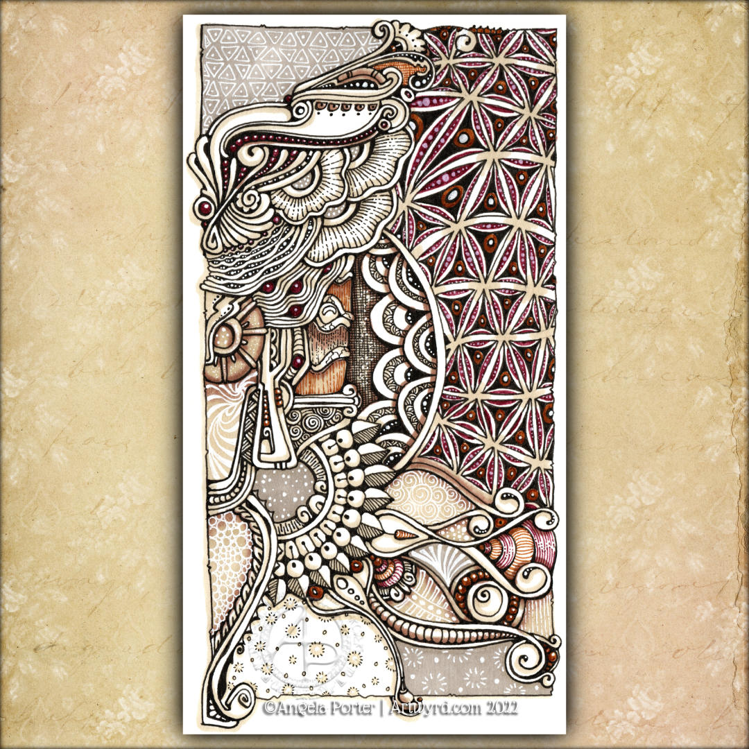 A friend thought it was rather ‘heraldic’ and expected to see a big letter in it! My next one will have a monogram as part of the design. It has a rather medieval feel and is typically Entangled with some Zentangle inspiration.