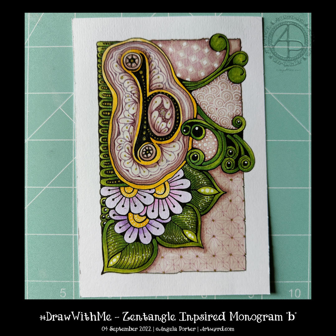 I’m continuing with my exploration of monograms and patterns. This one is a bit odd with the ba sitting above a pool or pebble..or something. But I quite like the patterns I’ve used to embellish it. I’m also rather fond of the background patterns, especially the very faint ones to the bottom right.