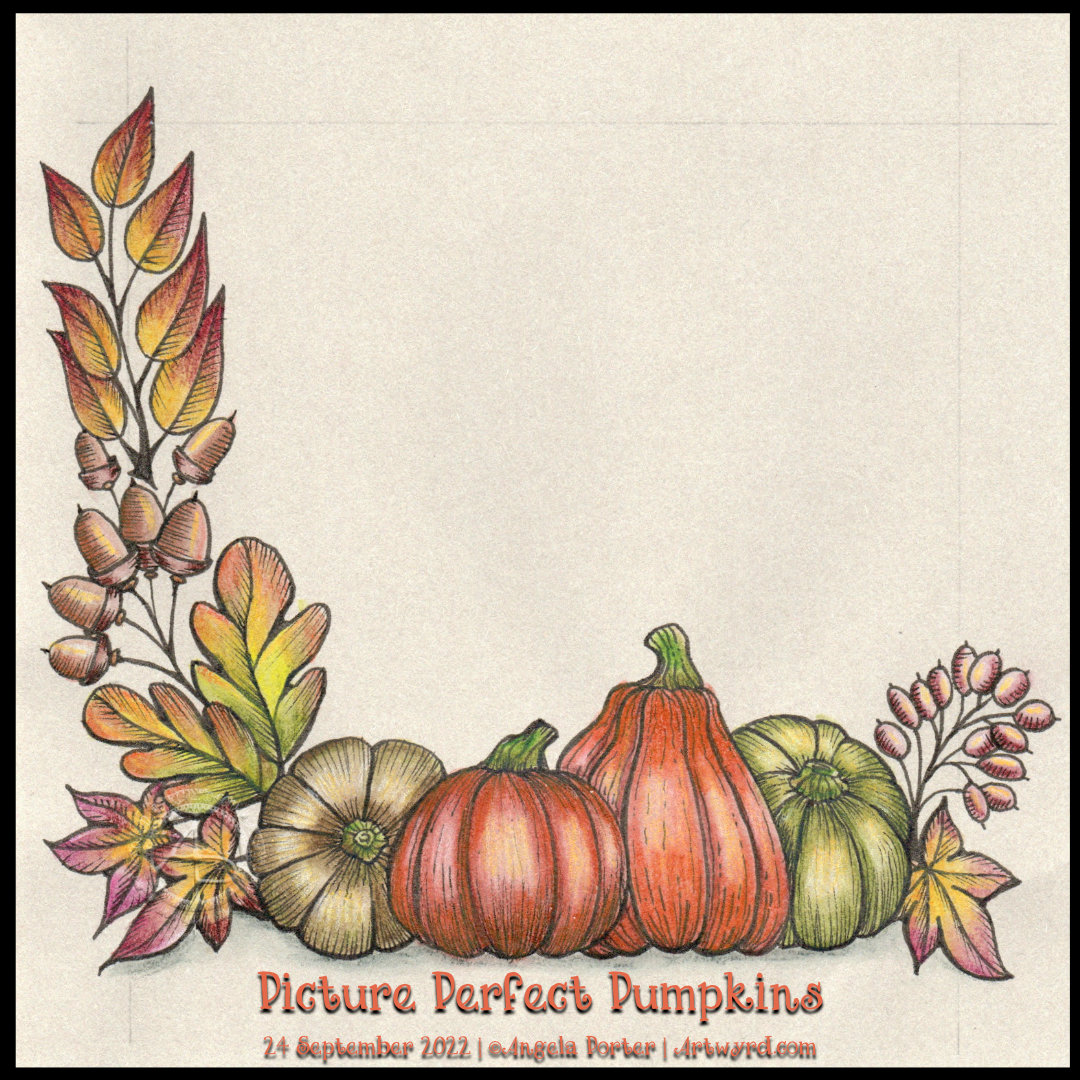 You can tell I love autumn! I just couldn’t resist another drawing with pumpkins and assorted autumnal motifs. In the video accompanying this picture, I get all the drawing done and start adding colour. This photo is of the completed drawing so far. There’s plenty of space for some more autumnal goodies!