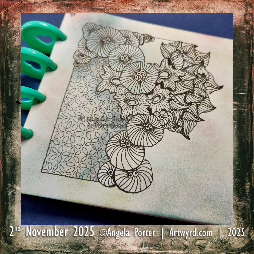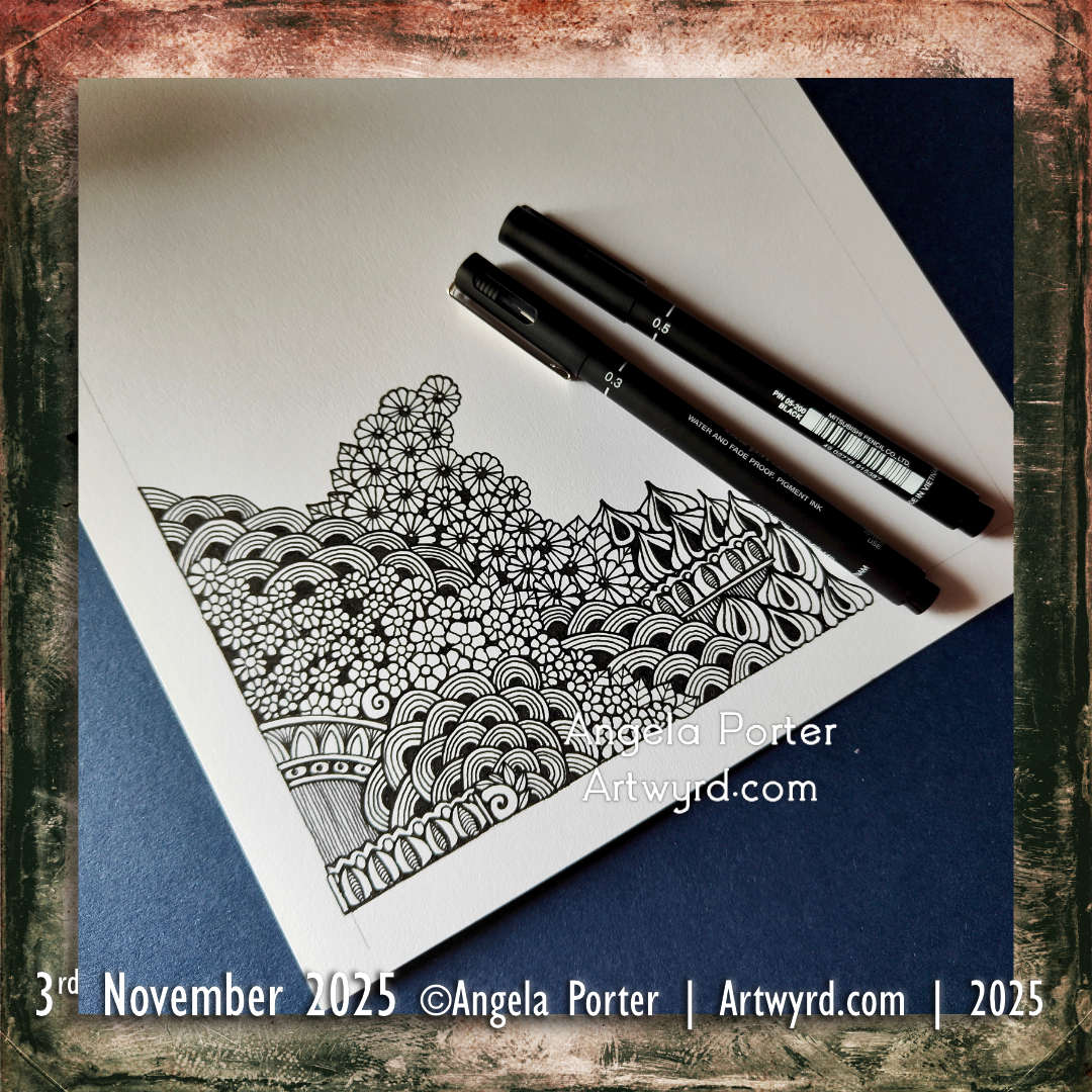 This one is something I’m working on away from the cameras. I’m using a letter-sized piece of paper and, again, a limited number of patterns/motifs. I’m using 0.5 and 0.3 Unipin fineliners as I find I really do like bolder lines. If I use finer pens it never feels right to me, and I think I have to learn to trust my own instincts and tastes a lot more.