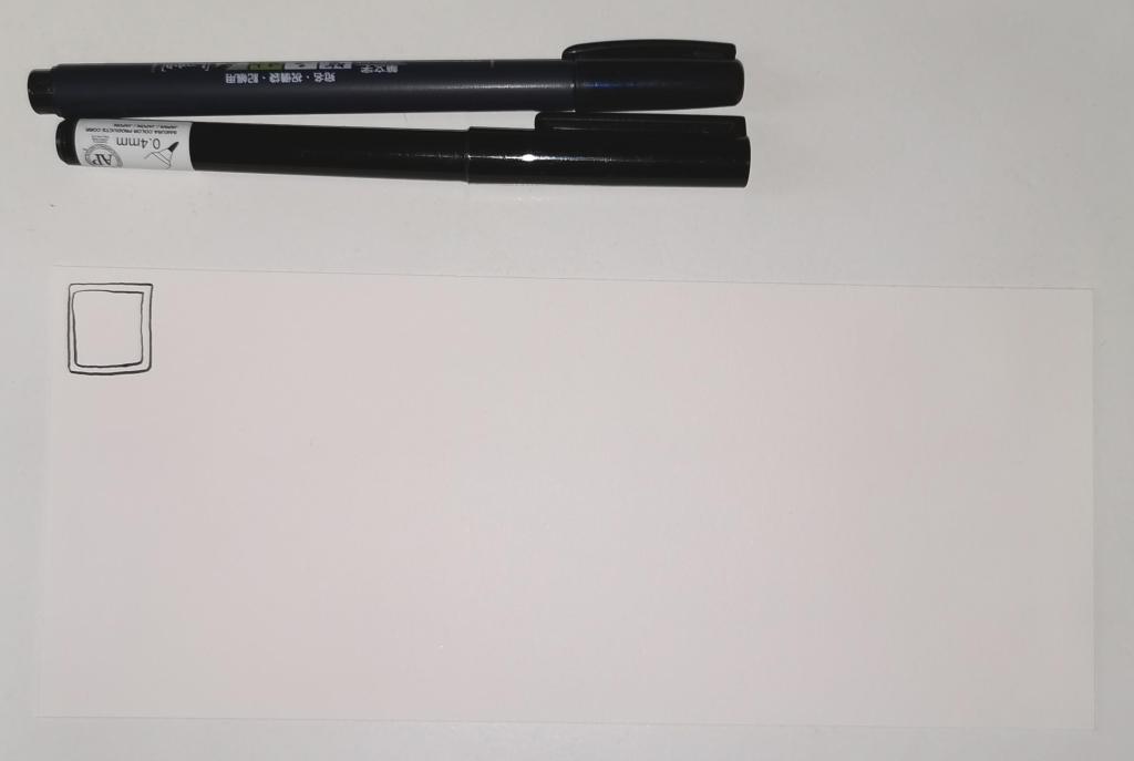 Step 1 Draw a square in the top left corner of a piece of paper. I used a piece of paper measuring approx 8.25″ x 3.5″. I used a Tombow Fudenosuke brush pen to draw the box, and outline it. I deliberately made the squares less than perfect to give that human touch as well as a uniquely ‘me’ way of drawing boxes. The Fudenosuke pen allows me to draw lines of variable width quite easily, which adds to the charm of the box. The ink in the pen is also alcohol marker friendly. Letting your drawings be less than perfect is what makes them uniquely yours.
