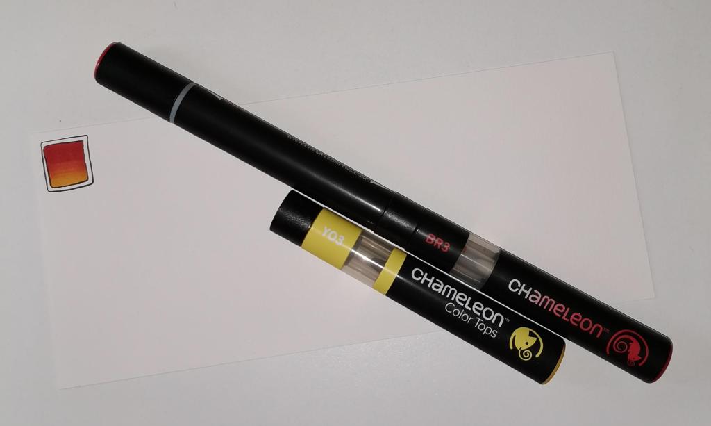 Step 2 I used Chameleon marker pens (BR3 “Cinnamon” and YO3 “Warm Sunset”) to colour the inner box. Autumn is definitely here in the UK, and the combination of these colours reminded me of the leaves. However, you could use any colour combination you like and any medium you prefer to use. Chameleon pens make it so easy to create a colour gradient – I prefer them to other alcohol marker pens, even Copics.