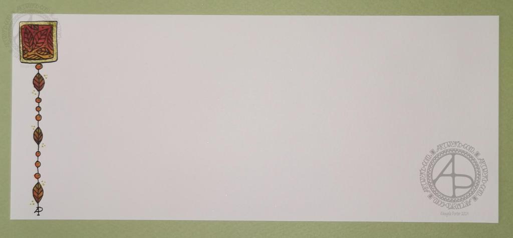 I’ve put the dangle design on one side of a slip of paper that would make a perfect compliment slip or a note to slip in with a gift, or just as a short letter to a friend. It would also be perfect for a coordinating piece of envelope art!