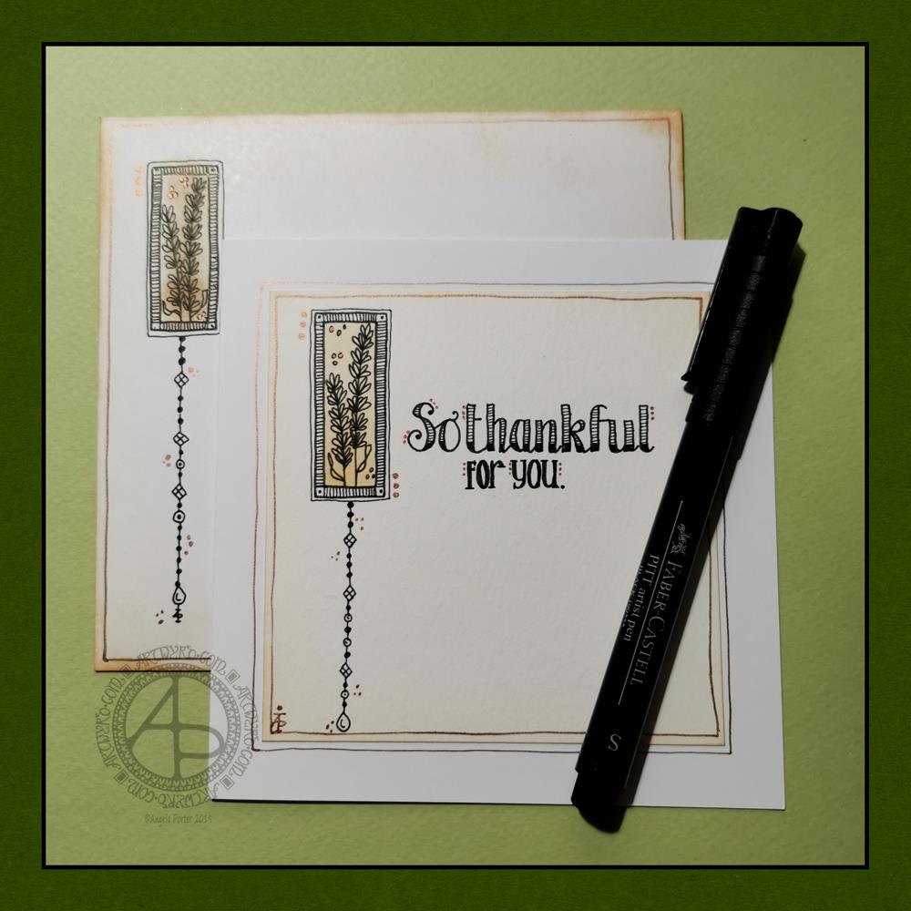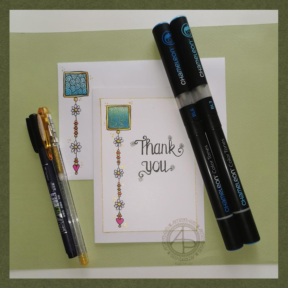 Today, I have a simple dangle design greeting card along with a coordinating envelope. If you’d like some more ideas, inspiration and step by step instructions for drawing dangle designs then my book, A Dangle A Day, is a good place to start.