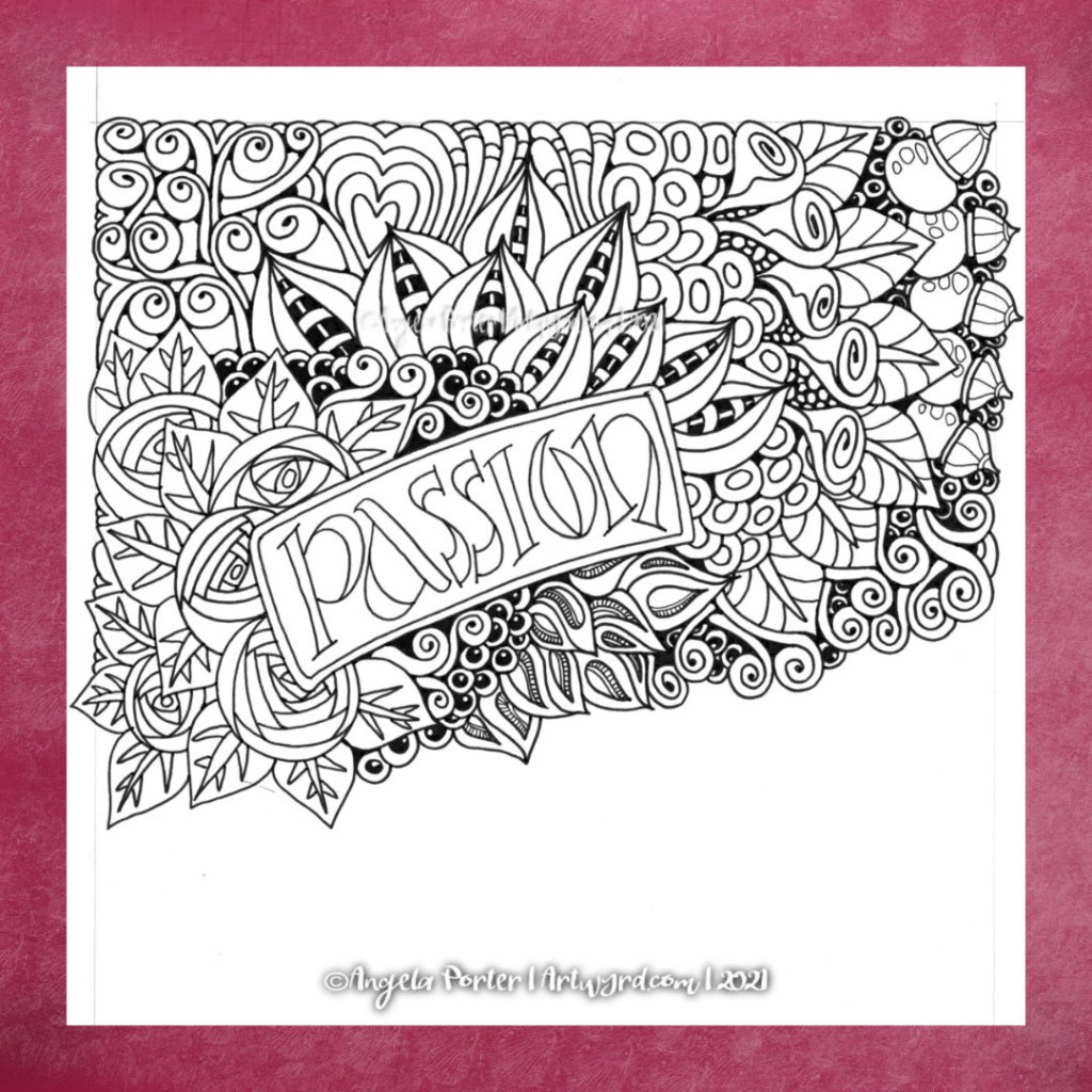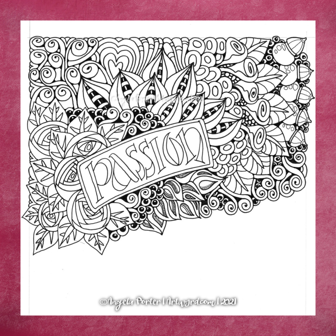 I finished drawing ‘Passion’ this morning. The original is black pen on white paper, but I’ve manipulated it a little for the social media post. I kept to a relatively small number of motifs in the design, which gives it a bit more of a coherent ‘feel’.