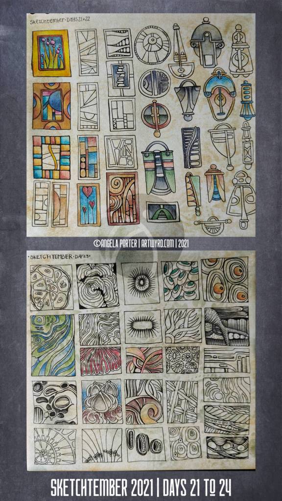 I started by drawing a pencil grid of squares and triangles to work in. Next, a visit to TanglePatterns.com led me to the motifs, or fragments in Zentangle-speak, that I wanted to use.