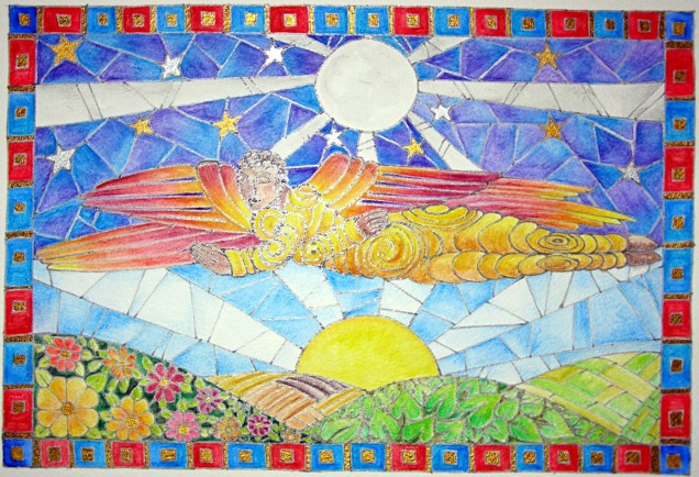 I rather like the bright colours, achieved using Kuretake’s Zig Clean Colour Real Brush Pens and a water pen. I like both the white and black outlines, though I do prefer the black; they make the image look more like stained glass.