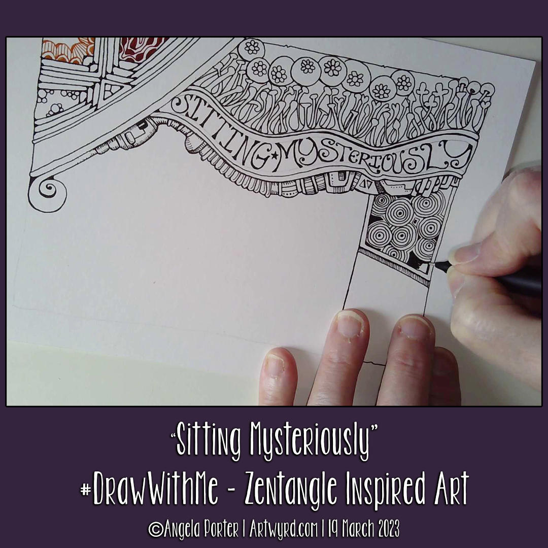 This was a fun ‘Draw With Me’ drawing tutorial on YouTube. Unusually, I used a lot of Zentangle tangle patterns – Arukas variation, Crescent Moon variation, Tipple variation, Quabog, Sez and Mooka. Plus a couple I like to draw – the flowers within circles and the mechanical kind of things under the hand lettering.