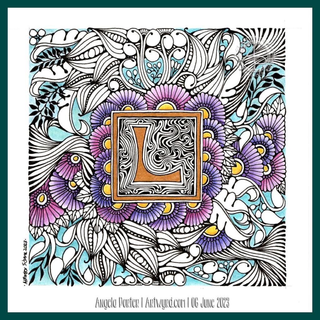 I drew this design partly as I settled and calmed down for sleep, then completed it when I awoke at stupid o’clock until I was ready to settle back to sleep. Now, I’ve started to add colour – Derwent Chromaflow with Gamsol to blend the colours out. Oh and gold ink for the ‘L’ and the border around it.