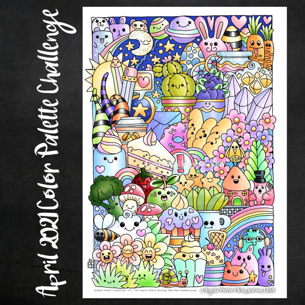 Over on the Angela Porter’s Coloring Book Fans facebook group, we have a monthly color palette challenge. April’s was a pastel rainbow colour palette which went beautifully with the cute, whimsical, kawaii, Doodleworlds coloring template.