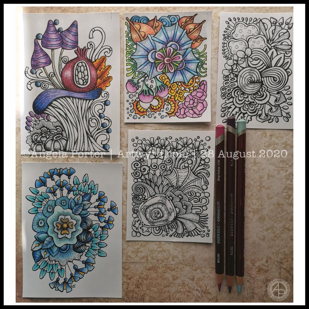 I then spent another half hour or so experimenting with fineliners and white, metallic and glitter gel pens to add texture and pattern to the coloured areas. I didn’t film that though, but the results are in the photo above.