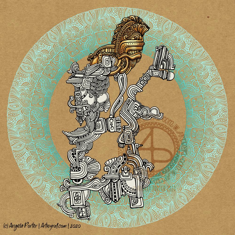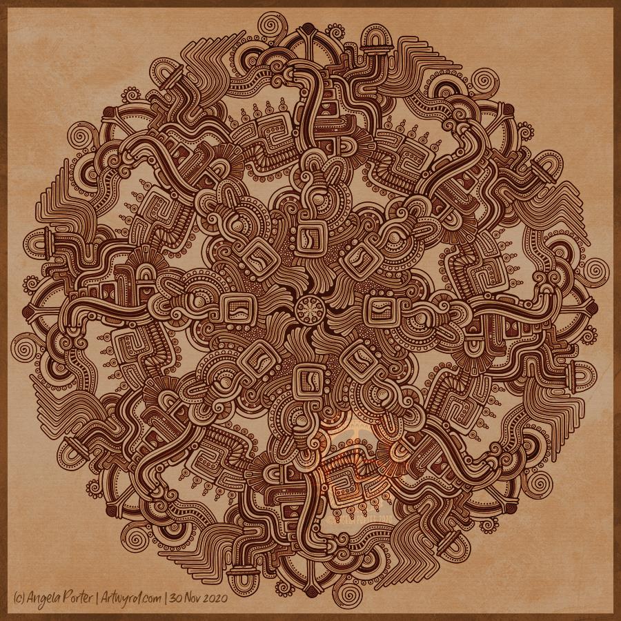This week’s mandala is a tad different. I decided to take my entangled assemblage drawing from yesterday and create a ring mandala behind it. The patterns in the mandala are in keeping with the focal image.