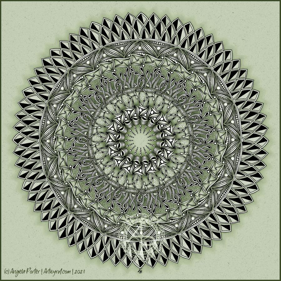 It’s Monday, so it’s time for a mandala. This one includes lots of Zentangle tangle patterns, many quite organic in nature.