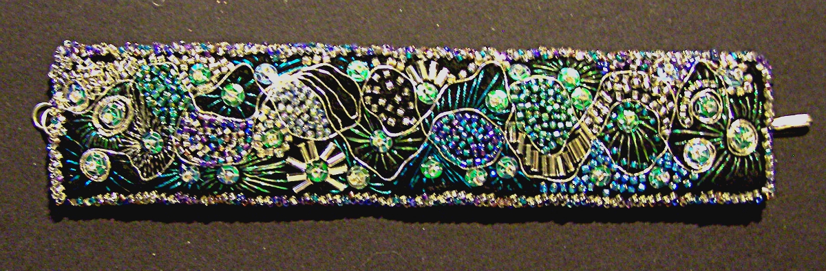 It’s most probably around 7½” long and around 1½” wide.  Silver ‘Japan’ thread, various metallic threads, sequins, and silver-lined Japanese seed and bugle beads were used to create the pattern on the top and to edge the piece.  Black felt is used as the background as it doesn’t fray and gives a wonderfully dark, matt background in contrast to the sparkle and shimmer of the surface decoration.