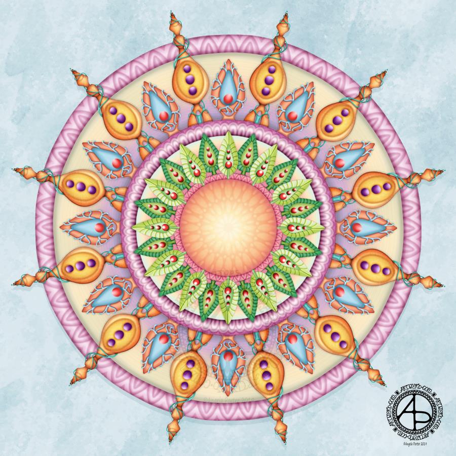 The mandala in the background has the Nik tangle pattern forming the wider geometric patterned ring. The outer ring is a line drawing of Xanthoria elegans – the sunburst lichen.