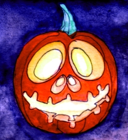 The drawing of a pumpkin punkie was done using a very fine technical drawing pen (0.1mm) and watercolour paints on cartridge paper.  The sketch was completed very quickly, the painting took a little longer as the white purry-furry one wanted to help/hinder by demanding cuddles and fusses!   I then fiddled with it in GIMP2 to make it more vibrant in colour, more blurry and better looking than the original!  I have a couple more done that I’ll use to decorate any entries I do about Hallowe’en.