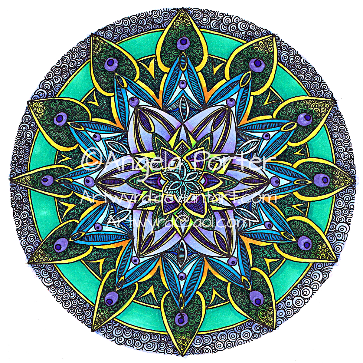 Approx 16cm square. Unipin pens, Zig Art and graphic pens and water wash, Gold Stickles and silver and gold UniBall metallic gel pens.