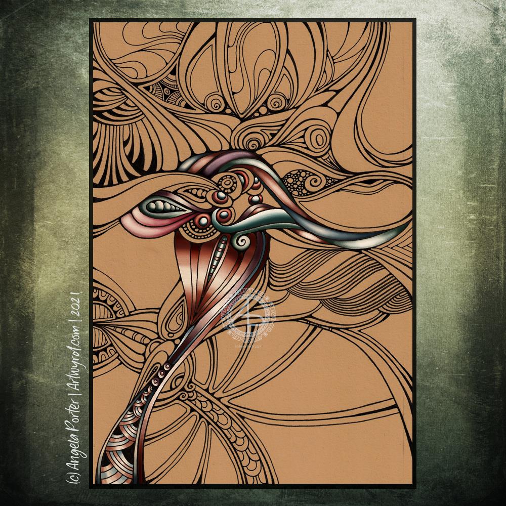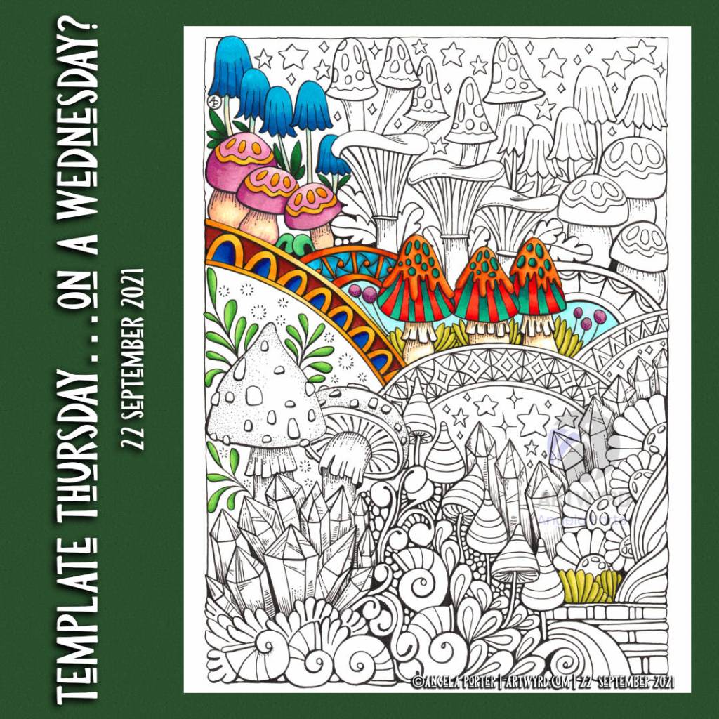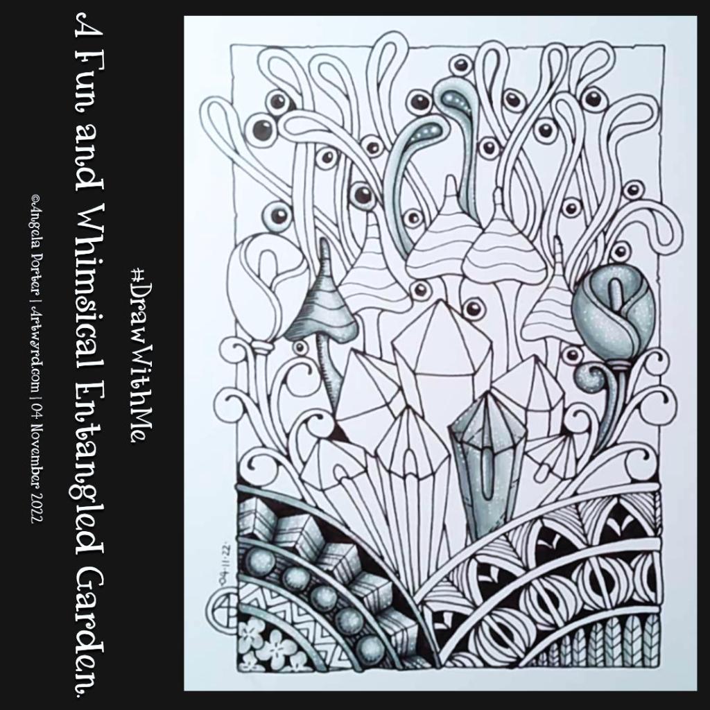 I had a lovely time drawing this little garden this morning. It includes some of my favourite things – round Romanesque-inspired arches and some Romanesque patterns, zentangle tangle patterns, crystals, flowers, mushrooms and frondage.