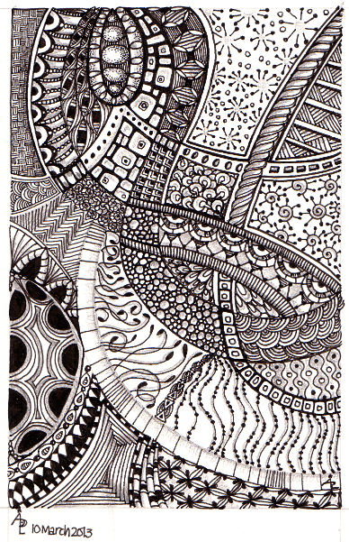 As is my wont, I had no preconceptions of how the entangling would unfold. I just let it flow. Some of my favourite motifs and patterns have been used. I did refer to my visual BuJo for ideas/inspiration from time to time too.