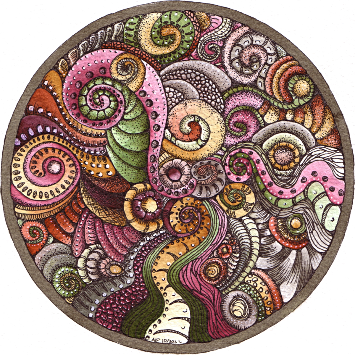 This little pattern was created using Inktense pencils from Derwent, and a Pitt Artist Pen from Faber-Castell. Oh, I also used a Kuretake Zig water-brush to blend out the Inktense pigment.
