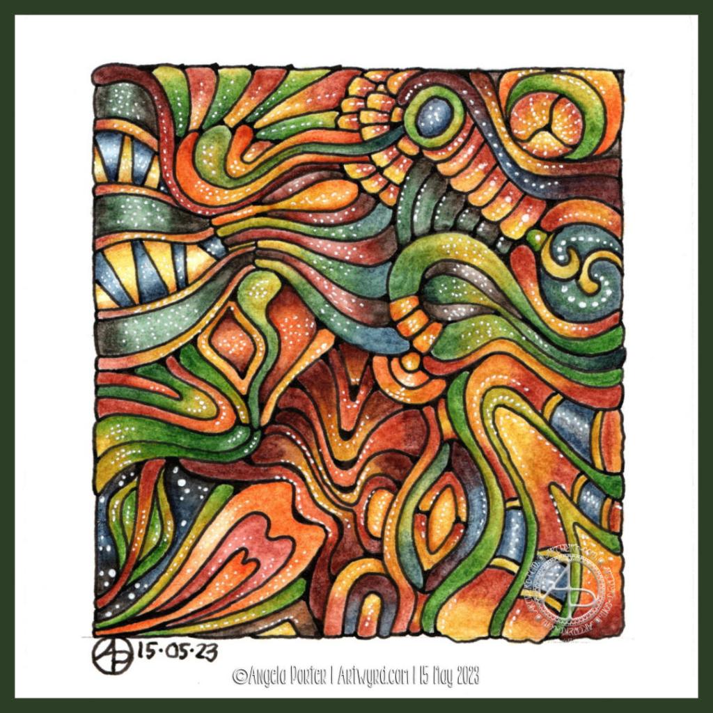 I had a lovely couple of hours this afternoon drawing and then adding colour to this small artwork. And small it is; the paper I used is an approx 10cm x 10cm (about 4″ square) piece of Canson Imagine mixed media paper.