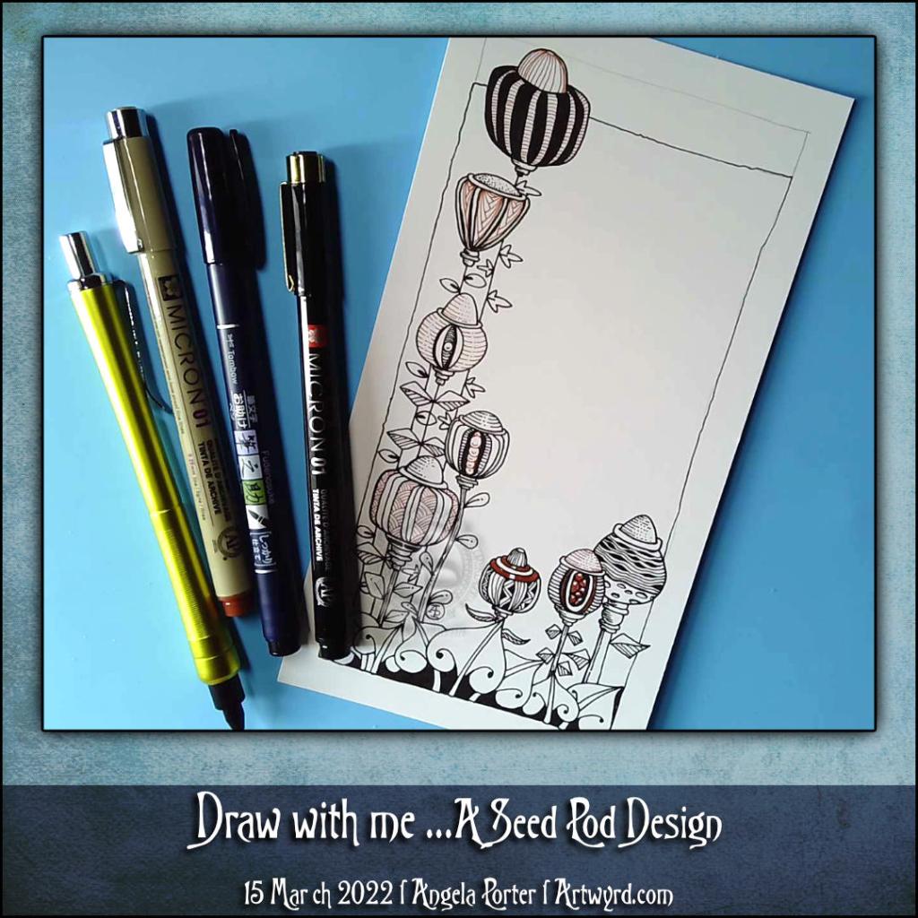 I also used a couple of Zentangle tangle patterns to add interest to the seed pods – between, purk, tipple and diva dance. The tangle Toodles created the foliage at the bottom of the page.