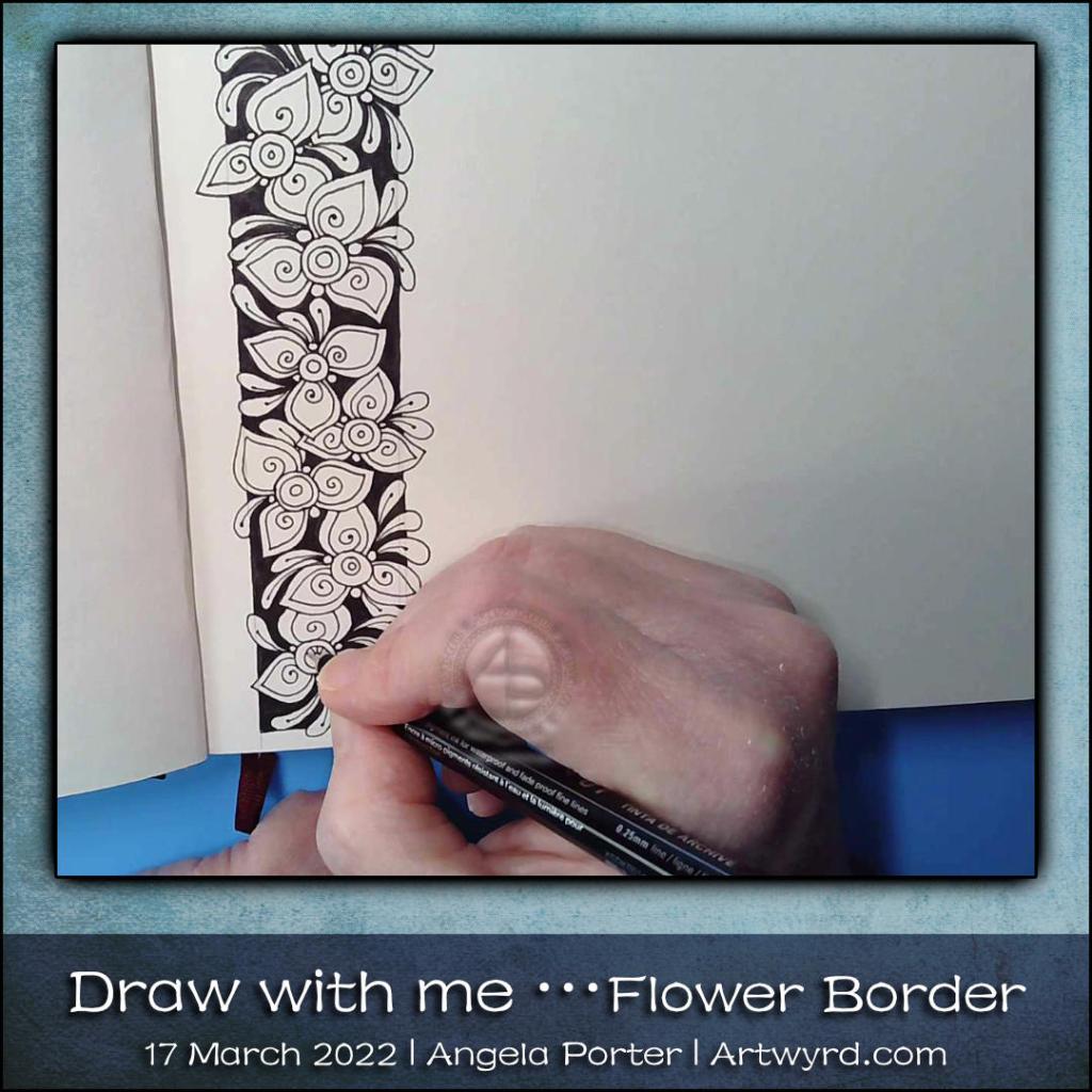 There are never enough flowers in my life. I’ve really enjoyed drawing flowers (and seed pods) over the past couple of days. So, I thought I’d make use of one of the flower motifs from yesterday to create a border on a page edge in my sketchbook.