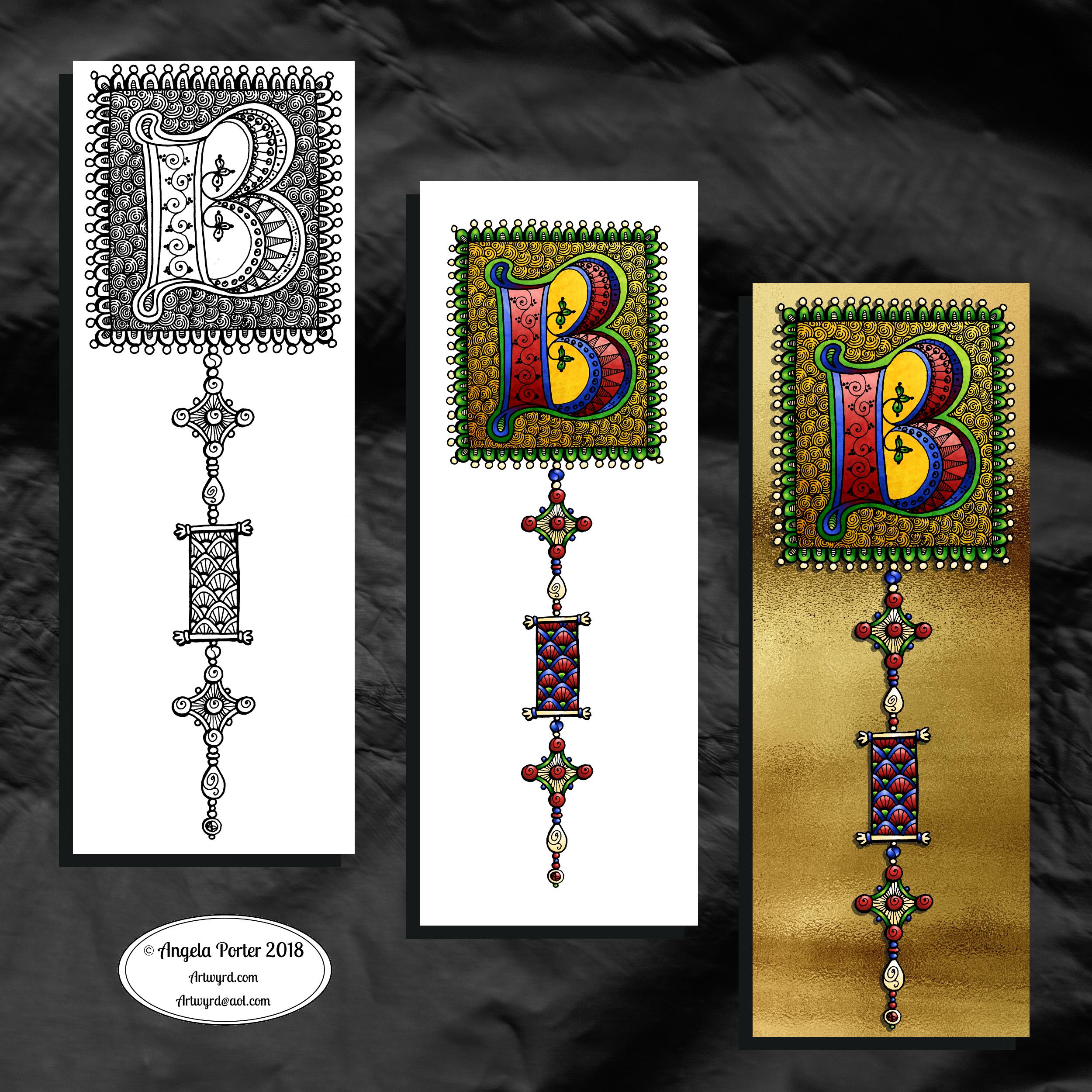 The first is just the black and white line art. This was drawn with Uniball Unipin pens on dot grid paper then scanned in so the dot grid and faint marks could be removed as well as making a transparent background. This dangle design is much more ornate in terms of pattern than is in my book ‘A Dangle A Day’ but is still easy to do if a bit time consuming.