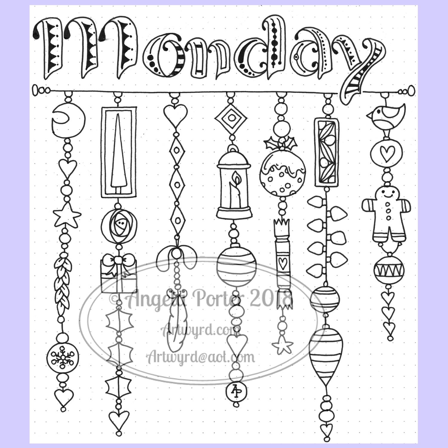 The dangles were drawn with pen directly on paper. The use of dot grid paper helps to keep things vaguely level usually, but this morning that’s not quite gone to plan. Of course as it’s December I’ve gone with December themed charms and a Moon for Moonday Monday!