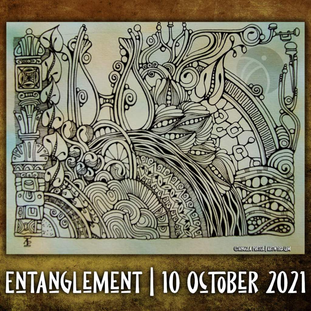 This drawing, on the right, was a pleasure for me to indulge in. It’s a typically ‘Angela’ entangled drawing with plenty of detail and characteristic curves and swirls and arches. Some tangle patterns have found their way into the artwork, which is to be expected as I’m focused on such things at this time.