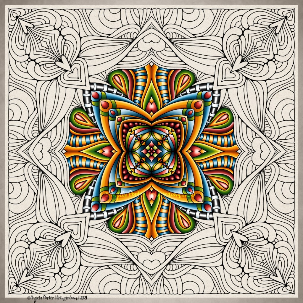 Monday is mandala day! I’ve been working on this one all morning, and you can see there’s a lot of work to be done to get it all coloured!