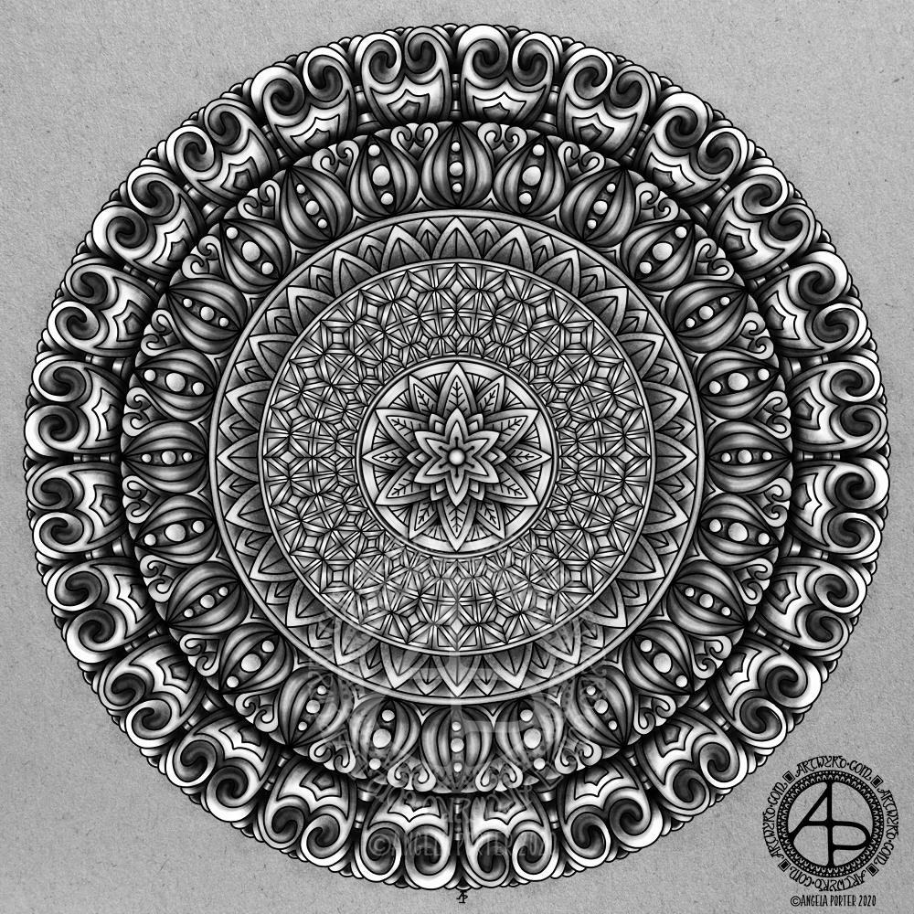 This mandala took an unexpected turn as I was adding colour. I was experimenting with brush settings in Autodesk Sketchbook Pro, particularly the ‘colour’ setting. This will change the colour of any area, but preserves the shadow/light values. I thought I’d see what happened when I used grey as the colour, and I liked the monochrome that resulted. So, I completed the mandala in a similar way.