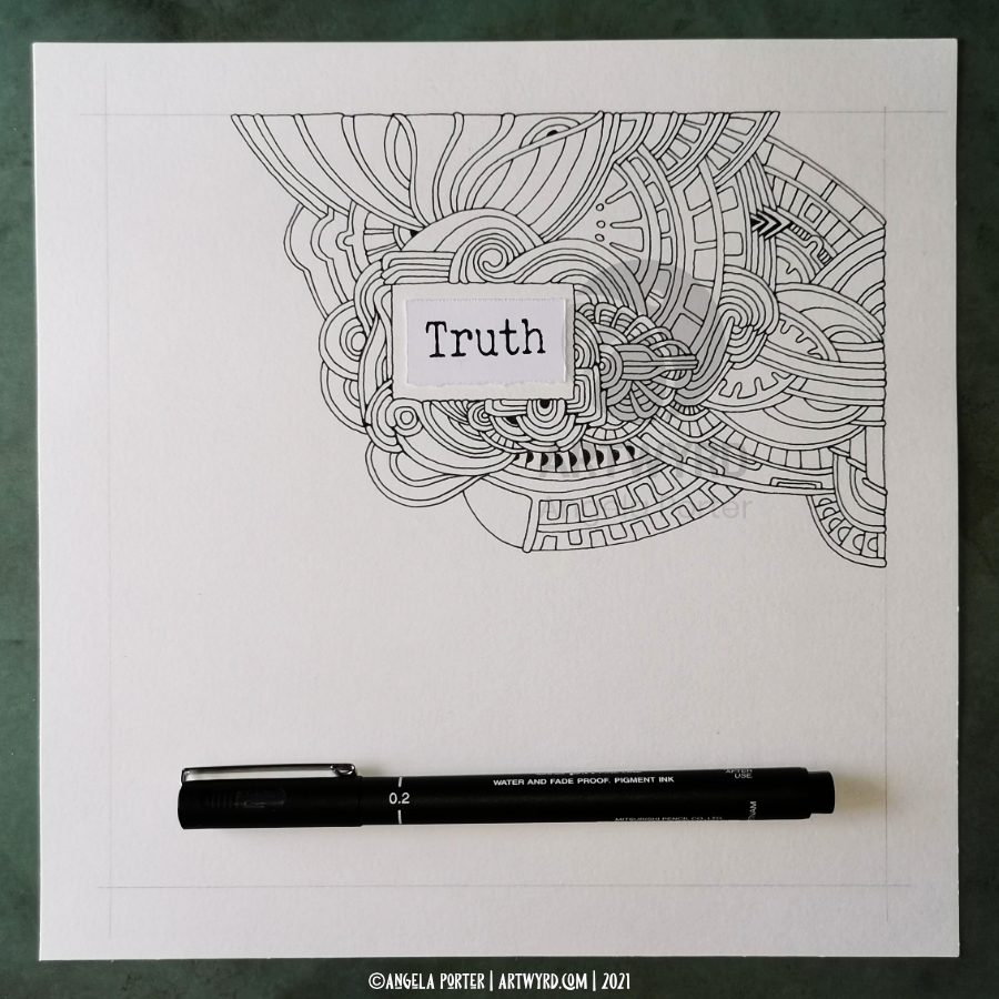 Today’s morning drawing is the start of this rather abstract design around “truth”. The paper is 20cm x 20cm (approx 8″ x 8″).