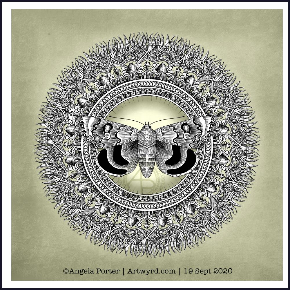 Of course, I’m still working on the first moth entangled drawing/illustration, so adding a mandala behind this drawing is a quick and easy way of adding to the moth. Mandalas are kind of my thing to do.