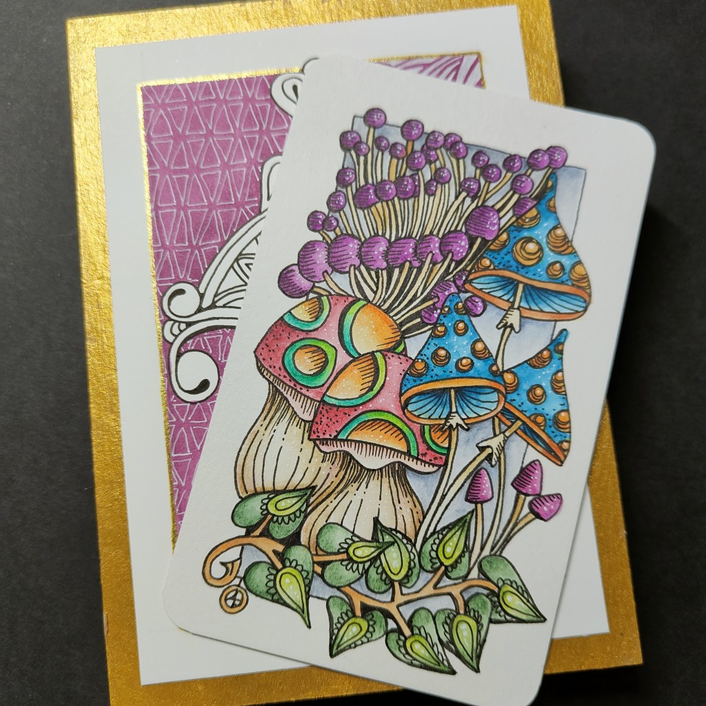To add colour, I used Inktense pencils with a Kuretake Zig water-brush. Oh, and the ‘frame’ was coloured with iridescent gold watercolour paint. And that gave me the perfect excuse, not that I needed one, to scatter some gold dots around the background. Oh, the white dots on the ‘shrooms and foliage were applied with a Sakura white Soufflé pen. Its opaque white ink is perfect for this job, especially as it doesn’t seem to pick up any underlying colours. Must remember to get some more of them.