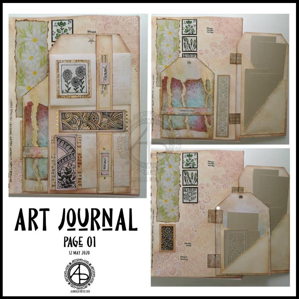 Yesterday I got lost in finishing the first page in my new A5 journal. I’ve put together three photos that show how the page looks as the tags are folded in and as each is opened out.