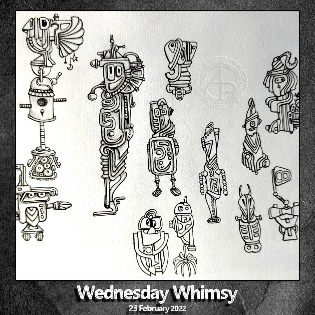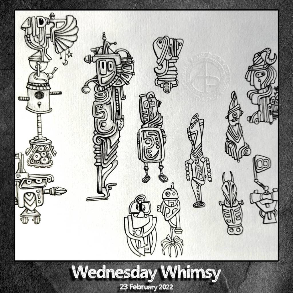 But my drawing style has exerted its muscle …and these are typical ‘Angela’ style drawings! Actually, I had started to work on some new bots and characters for my Doodleworlds style of cute and whimsical art. But Bill gave me, unknowingly by him, the push to have a go at drawing these creations.