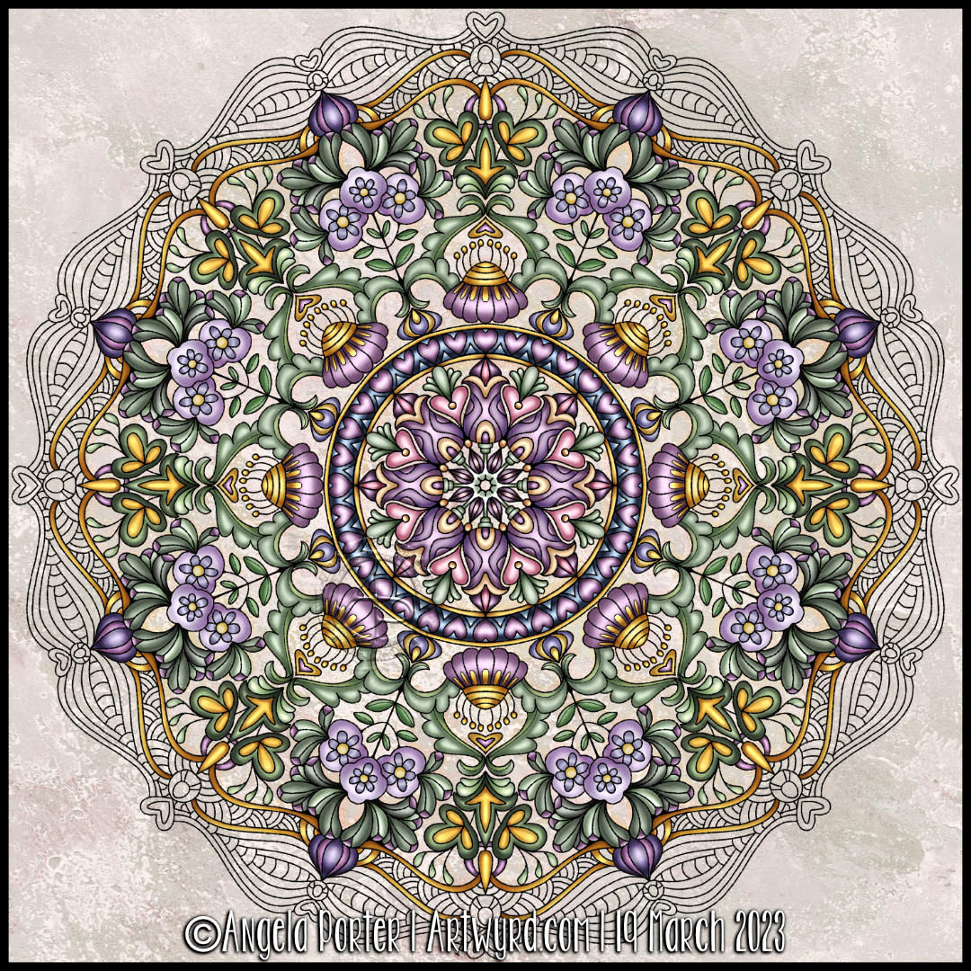 I love drawing mandalas. I love the symmetry, the flow, the sense of calmness that they bring when being drawn or coloured. I am fascinated with the never-ending possibilities of mandala design. They also make it easier for me to arrange motifs and patterns when my head is filled with pink fluffy and sparkly fairy dust (all due to prescribed medication).