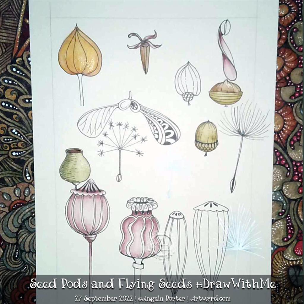 I love seed pods, and here is a small selection of my favourite ones, just pen sketches with some light washes of Inktense added to some.