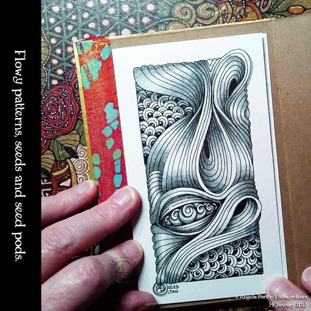 I love curvy, flowy, abstract patterns and the illusion of depth, volume, twisting, and bending space. And seed pods. And seeds. So lots of my favourite things in this design. I even snuck in a few spirals!