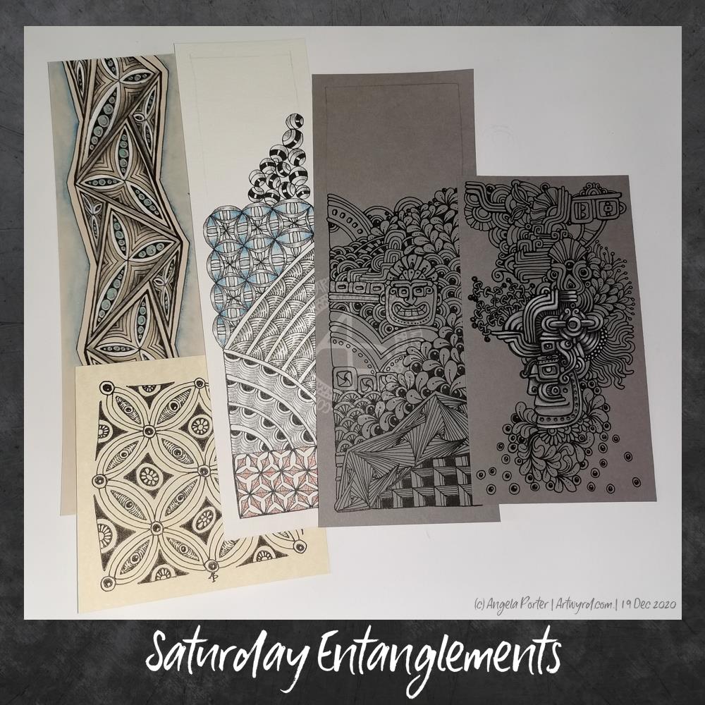 My emotions are out of sorts. I’m dissatisfied with almost everything I do artistically at the moment, so I stepped back in time to do entangled zentangle-style drawings, with a twist here and there. Small projects. Pens and pencils on various paper. If something doesn’t work out, well it’s not great shakes, I just carry on and try to accept it for what it is, and learn a bit more about what works and what doesn’t.